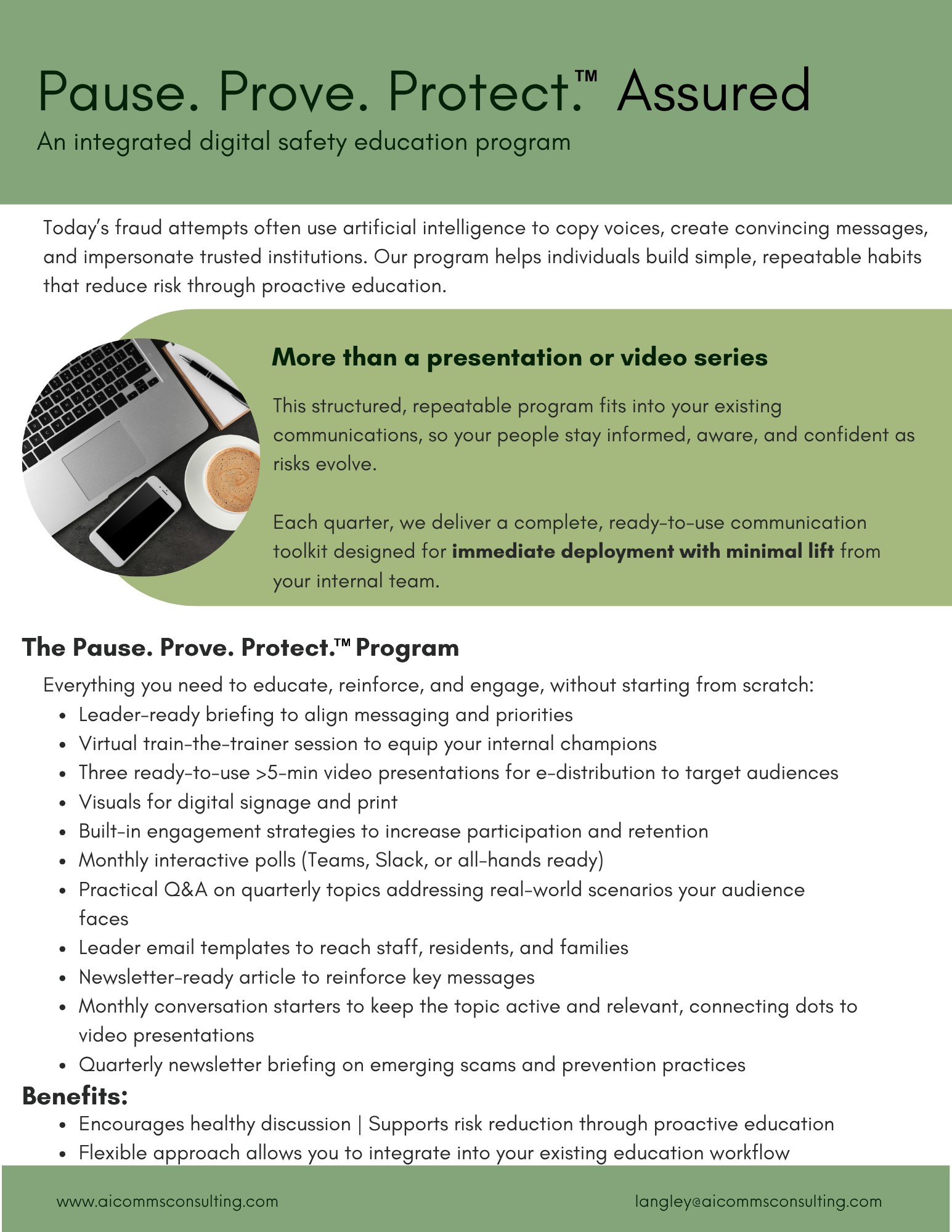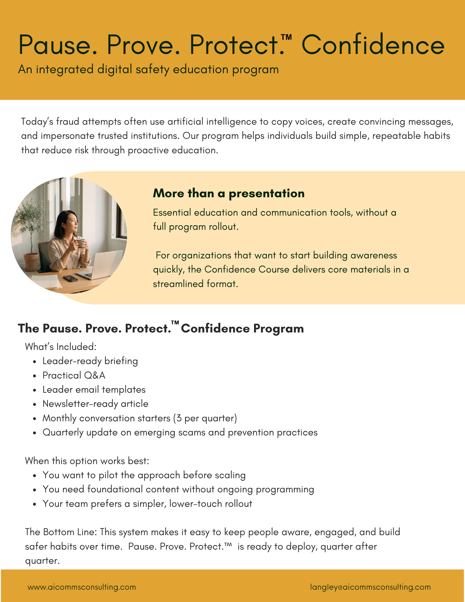 Today’s fraud attempts are increasingly using artificial intelligence to copy voices, create convincing messages, and impersonate trusted institutions. Our program helps individuals build simple, repeatable habits to support reducing risk through proactive education.